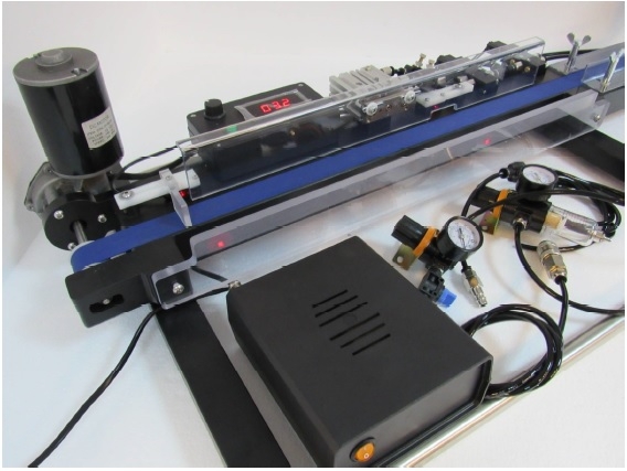 A rendszer két nyomás szabályzóval van ellátva illetve egy 40 micronos folyadék és por szenyeződés leválasztóval. A bojlihurka szeletelése a kinyomó tölcsérnél egy pengével történik. A pengét egy infra kapcsoló hozza működésbe mely a szeletelő egység közepén található. A pengés szeletelésnél nincsenek levállt bojli tészta darabkák és semmilyen szennyeződés. A bojli hurkákat szállító szalllag szállítja és nem görgősor. A szállítószallag sebség szabályzóval van ellátva! Mikor a szeletelés végbement és a levágott bojlihurka a szállító szallagon van és eléri a második infra kapcsolót a szeletelő egység lapátja a bojli rollerbe löki.