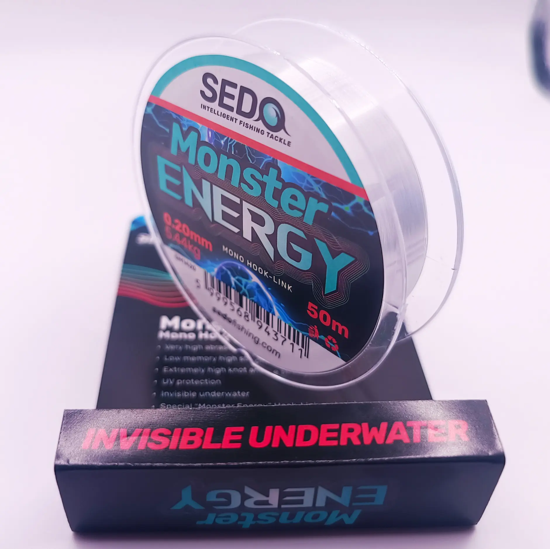 A legerősebb Co-polymer alapanyagból készül a Monster Energy Monofil előkezsinór. Egyedi és kivételes tulajdonságait már az első csomókötésnél érzékeljük. Rendkívül erős és puha zsinórt tarthatunk a kezünkben. Extrém magas csomótűrése és szakítószilárdsága a legzordabb körülmények között is megállja a helyét. Tökéletesen simul és összecsúszik bármilyen csomónál ezért szinte észrevehetetlen a halak számára az előkezsinór. Speciális bevonata védi a zsinór belsejét ezért ha merev vagy kemény tárgyal érintkezik a Monster energy egyszerűen elcsúszik rajta a kivételes „Energy” felület kezelésének köszönhetően. Tökéletesen láthatatlan a víz alatt ezért a legóvatosabb nagyhalak becserkészésében is hatalmas segítség lehet! Javasoljuk finomszerelékes, úszós, method, horgászathoz egyaránt.