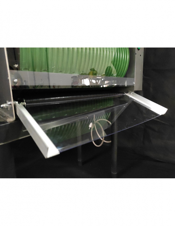 Nyitott végű plasztik tálcával tudjuk irányítani a rollerünkből kiguruló kész golyókat rekeszbe vagy továbbító szallagra.